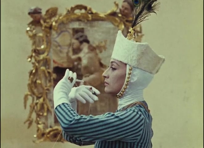Later, Ana wears a peacock feather plume—foreshadowed earlier by a porcelain vase with feathers in the bathhouse. Objects in this film echo across time.
