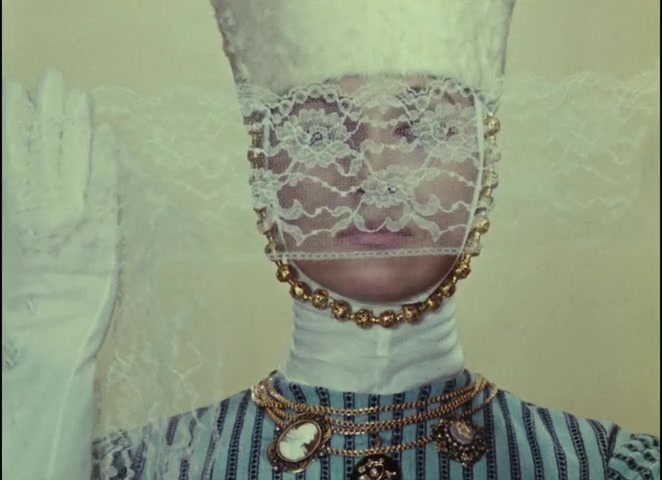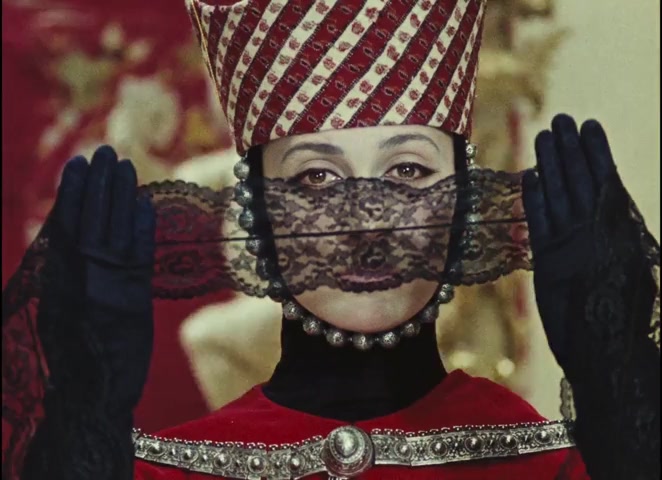 This image foreshadows the central visual motif of the courtship chapter: lace as barrier. Princess Ana, played by the same actress (Sofiko Chiaureli) who plays Sayat-Nova, is constantly shown peering through white lace. The lace is the thing that separates them. She makes it; he cannot cross it.
