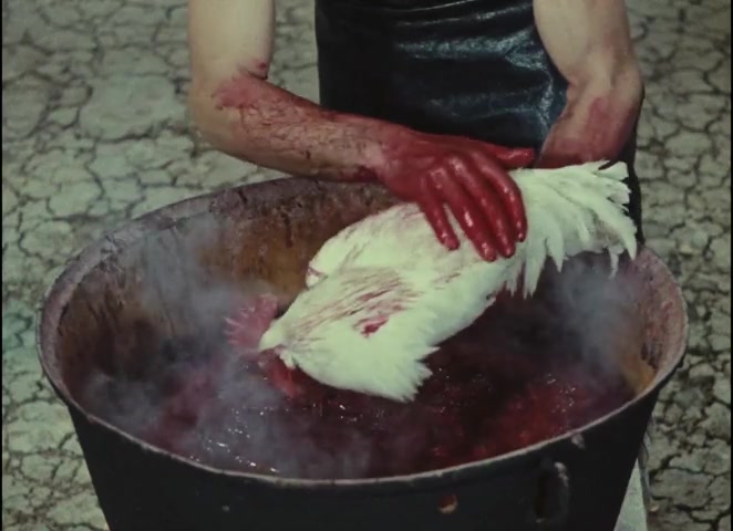 The first chicken in the film—being dyed red by faceless dyers.