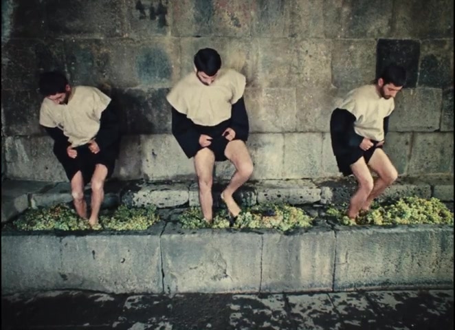 The pomegranate is the title image, yet it appears only twice in all of Act I. The first time: here, three pomegranates rest in a niche during the bathhouse sequence, as Sayat-Nova awakens to sexuality. The second time: monks devour them outside the monastery (shown above), juice running down their faces. That's it. Sexual awakening and monastic renunciation—the fruit of desire bookends the entire arc.