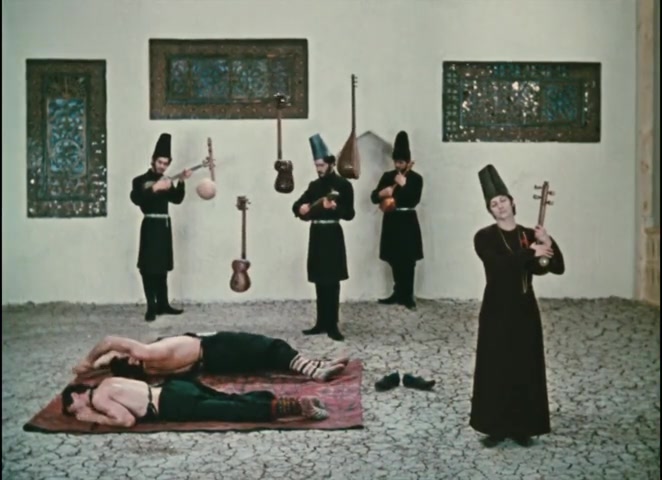 What we see is simple enough: around 15 minutes into the film, the adult Sayat-Nova plays music with other musicians on his family's porch. A tar (long-necked lute) plucks a melody—sensuous, associated with the Caucasian ashough (troubadour) tradition that Sayat-Nova belonged to. Then a church bell interrupts. The tar resumes. The bell interrupts again. This pattern repeats four times in rapid succession.