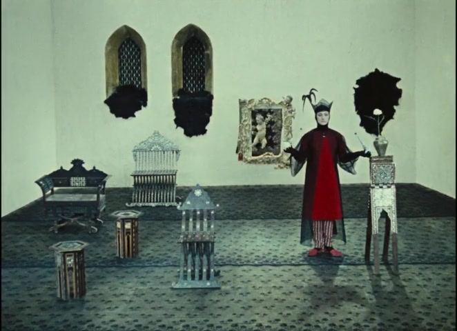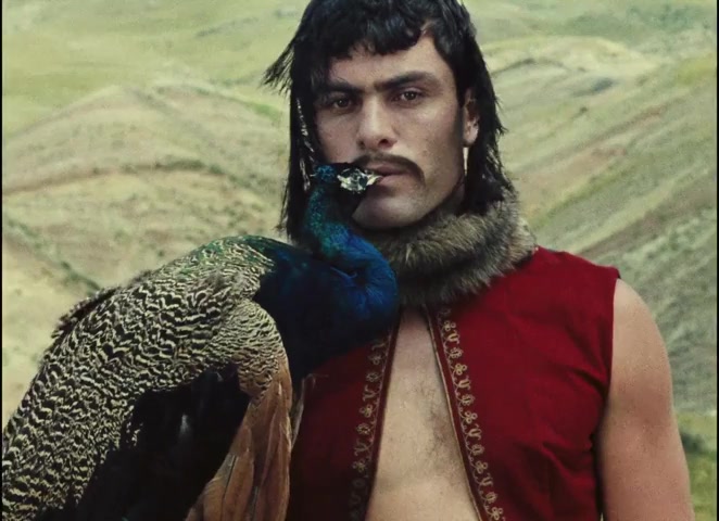 The abalone shell, established earlier in the bathhouse sequence held against a woman's exposed breast, represents feminine beauty and sexuality. The peacock feather represents masculine sexuality and Persian courtly display. By holding both, Sayat-Nova holds masculine and feminine, court and beloved, in precarious balance.