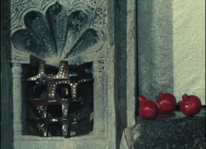 Images extracted from the 1969 Soviet restoration. Timestamps and analysis based on frame-by-frame annotation of the original Armenian title, Նռան գույնը (Nran Guyne).
