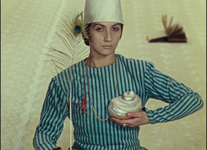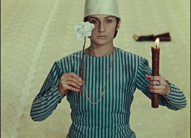 One of the film's most compressed symbolic images shows Sayat-Nova holding an abalone shell in one hand and a peacock feather in the other.