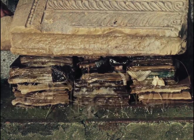 Books → Manuscripts: A church stone presses down on books to squeeze out water. The raw material of learning is compressed into sacred text.