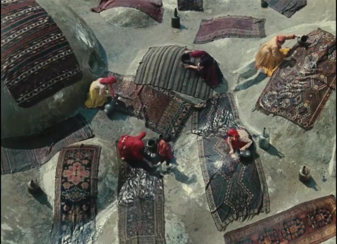 Women washing carpets. Textiles in this film represent feminine creativity and sexuality.
